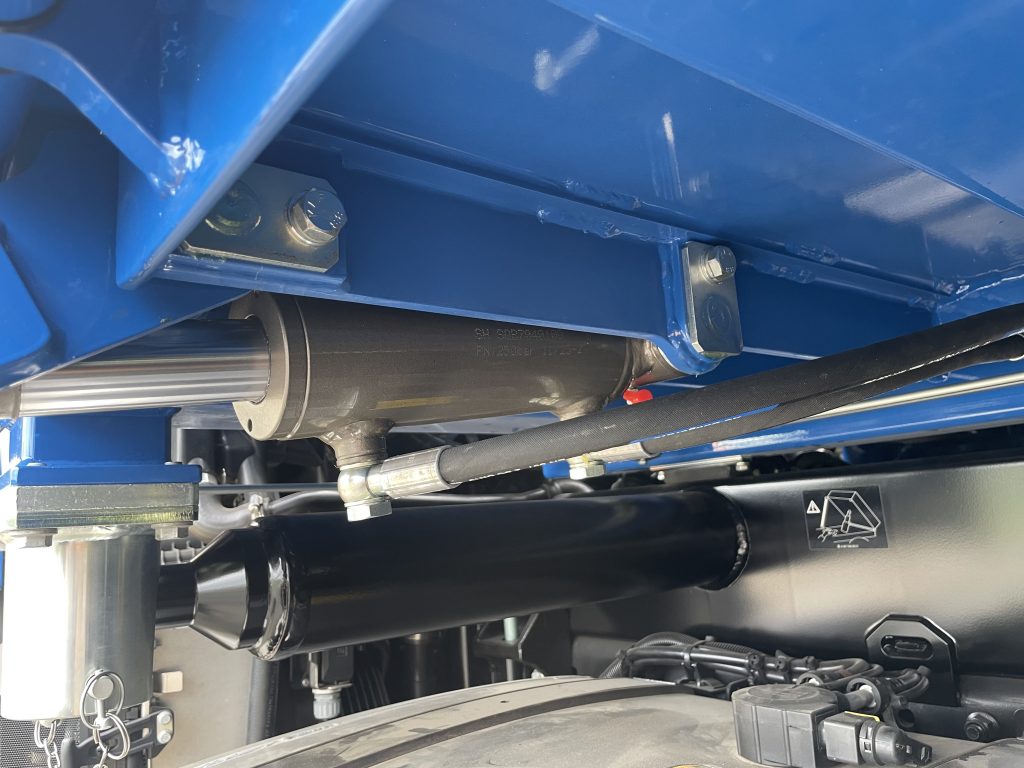 Wenn es der Einsatzzweck erfordert, können hydraulisch ausstellbare Bordwände zu jeder AS-Baugeräte Pritsche hinzugefügt werden. Egal ob mit Hardox oder mit normalen Stahlbordwänden, sowie in den gängigen Bordwandhöhen (40-80cm), ist dieses Option verfügbar. Auch hier ist für uns die Robustheit, Stabilität und Langlebigkeit äußerst wichtig. Wir setzen auf masive Umlenkhebel die mit Gleitbuchsen ausgestattet sind. Die gesamte Drehwelle ist abschmierbar und Gleitscheiben sorgen für einen saubern Öffnungs- und Schließvorgang. Die Hydraulikschläuche sind vor Außeneinwirkungen in der Runge bestens geschützt. Der Öffnungswinkel beträgt ca. 100° und kann in jeder beliebigen Stellung angehalten werden. Dank der Ablaufsteuerung, laufen die Zylinder für Verriegelung und Öffnung stets in der richtigen Reihenfolge, auch wenn die Öffnung der Bordwand nicht bis Anschlag ausgenuzt wird. Dank dieser Steuerung werden Fehlbedienungen und daraus entstehende Schäden vermieden. Auf Wunsch können bis zu 3 hydraulisch Ausstellbare Bordwände an einer Pritsche realisiert werden.